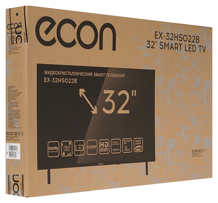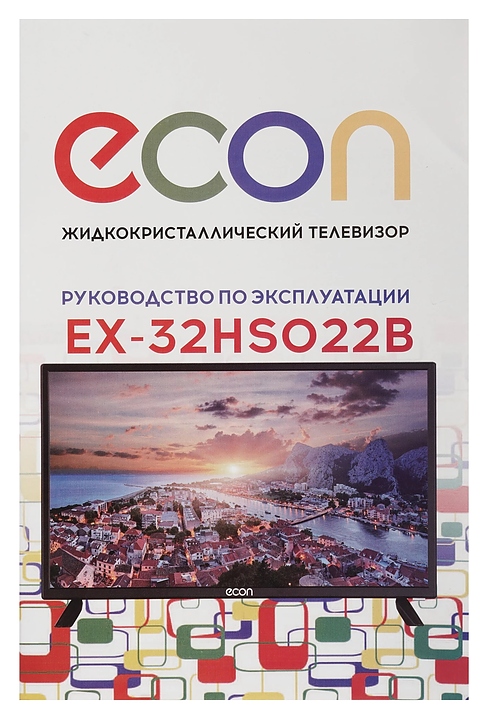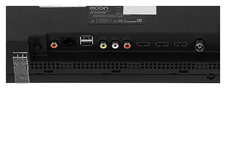 Телевизор Econ EX-32HS022B предназначен для приема и воспроизведения видео и аудио контента с различных ресурсов таких как телевещание, Интернет, дополнительное подключаемое оборудование и физические носители в домашних условиях, гостиницах, офисах, холлах и кабинетах различных учреждений. Прибор оснащен плоским монитором, акустической стереосистемой с 2 встроенными динамиками, встроенным блоком питания, кабелем питания с вилкой и основным выключателем, пульт – кнопочной клавиатурой. Кожух прибора выполнен из ударопрочного полимера с матовой поверхностью черного цвета, рамка экрана и подставка с поверхностью черного цвета, корпус пульта – из черного пластика.