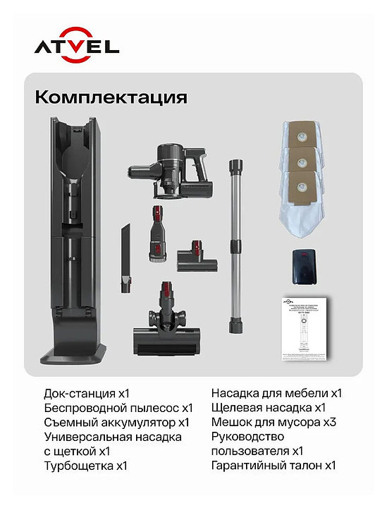 Пылесос вертикальный беспроводной Atvel Upright G9 Pro Base идеально подходит семьям, ценящим гигиену и простоту, он справляется с остатками пищи, жирными следами и даже старыми загрязнениями, продлевая свежесть напольных покрытий. Модель оснащена вертикальной парковкой, базой самоочистки и регулировкой мощности. Корпус изготовлен из прочного пластика, трубка телескопическая из металла. В комплект поставки входят док-станция для самоочистки, беспроводной пылесос, съемный аккумулятор, универсальная насадка, турбощетка, насадка для мебели, щелевая насадка, 3 сменных мешка для сбора мусора для док-станции, руководство пользователя, гарантийный талон. Особенности: