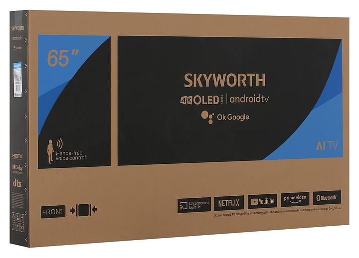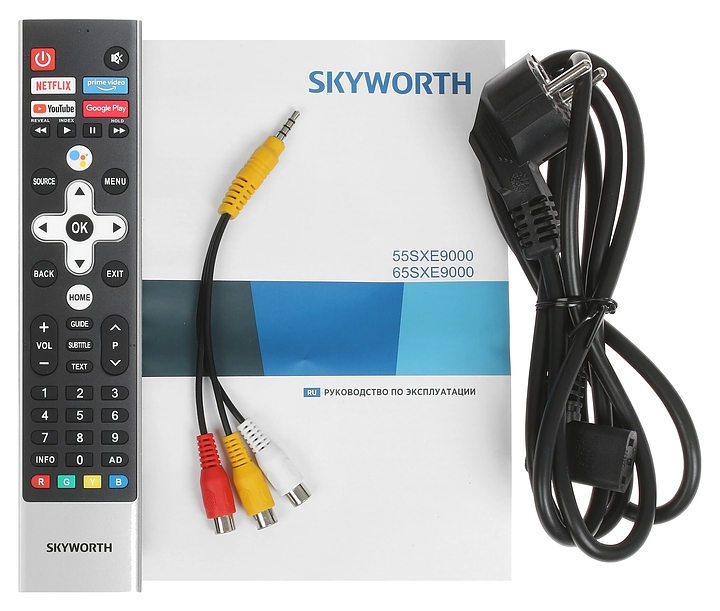Телевизор Skyworth 65SXE9000 предназначен для приема и воспроизведения видео и аудио контента с различных ресурсов таких как телевещание, Интернет, дополнительное подключаемое оборудование и физические носители в домашних условиях, гостиницах, офисах, холлах и кабинетах различных учреждений. Прибор оснащен плоским монитором, акустической стереосистемой с 2 встроенными динамиками, встроенным блоком питания, кабелем питания с вилкой и основным выключателем, пульт – кнопочной клавиатурой. Кожух прибора выполнен из ударопрочного полимера с матовой поверхностью черного цвета, нижняя рамка и подставка с поверхностью серого оттенка, корпус пульта – из пластика в комбинации черного и серебристого тонов.