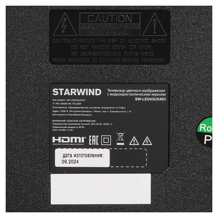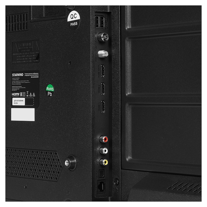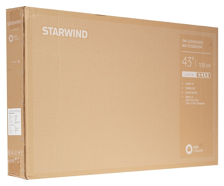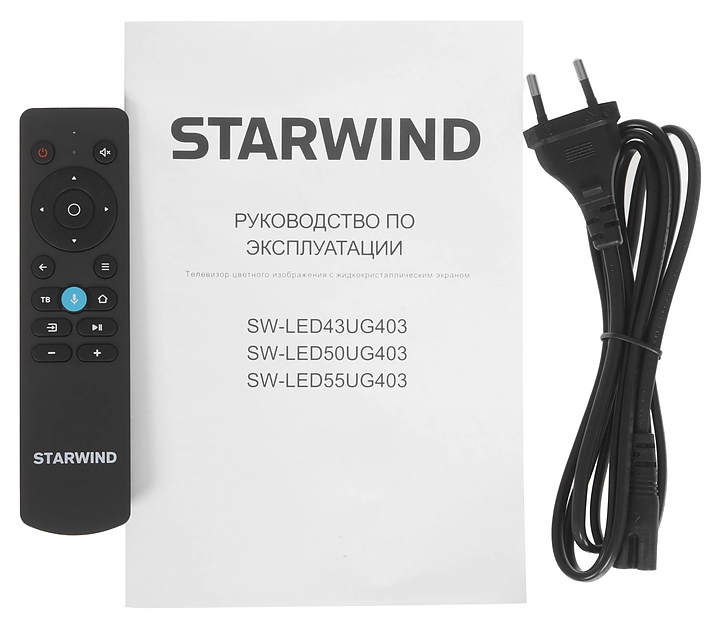 Телевизор Starwind SW LED43UG403 предназначен для приема и воспроизведения видео и аудио контента с различных ресурсов таких как телевещание, Интернет, дополнительное подключаемое оборудование и физические носители в домашних условиях, гостиницах, офисах, холлах и кабинетах различных учреждений. Прибор оснащен плоским монитором, акустической стереосистемой с 2 встроенными динамиками, встроенным блоком питания, кабелем питания с вилкой и основным выключателем, пульт – кнопочной клавиатурой. Кожух прибора выполнен из ударопрочного полимера с матовой поверхностью черного цвета, рамка и подставка – из пластика с поверхностью черного цвета, корпус пульта – из черного пластика.