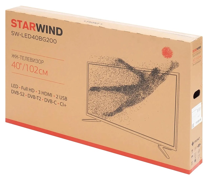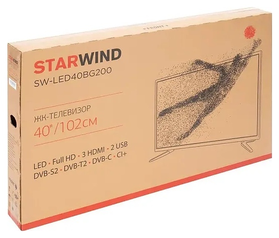 Телевизор Starwind SW-LED40BG200 предназначен для приема и воспроизведения видео и аудио контента с различных ресурсов таких как телевещание, дополнительное подключаемое оборудование и физические носители в домашних условиях, гостиницах, офисах, холлах и кабинетах различных учреждений. Прибор оснащен плоским монитором, акустической стереосистемой с 2 встроенными динамиками, встроенным блоком питания, кабелем питания с вилкой и основным выключателем, пульт – кнопочной клавиатурой. Кожух прибора выполнен из ударопрочного полимера с матовой поверхностью черного цвета, рамка и подставка – из пластика с поверхностью черного цвета, корпус пульта – из черного пластика.
