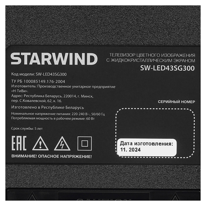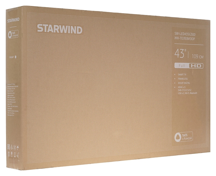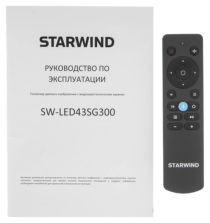 Телевизор Starwind SW-LED43SG300 предназначен для приема и воспроизведения видео и аудио контента с различных ресурсов таких как телевещание, Интернет, дополнительное подключаемое оборудование и физические носители в домашних условиях, гостиницах, офисах, холлах и кабинетах различных учреждений. Прибор оснащен плоским монитором, акустической стереосистемой с 2 встроенными динамиками, встроенным блоком питания, кабелем питания с вилкой и основным выключателем, пульт – кнопочной клавиатурой. Кожух прибора выполнен из ударопрочного полимера с матовой поверхностью черного цвета, рамка и подставка – из пластика с поверхностью черного цвета, корпус пульта – из черного пластика.