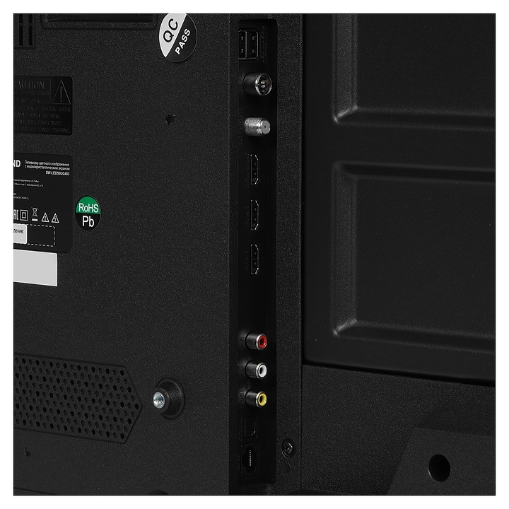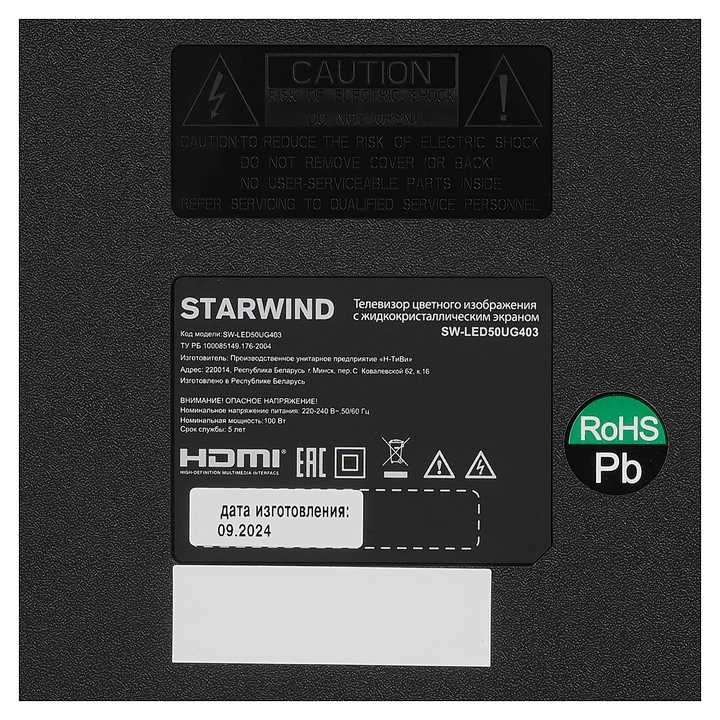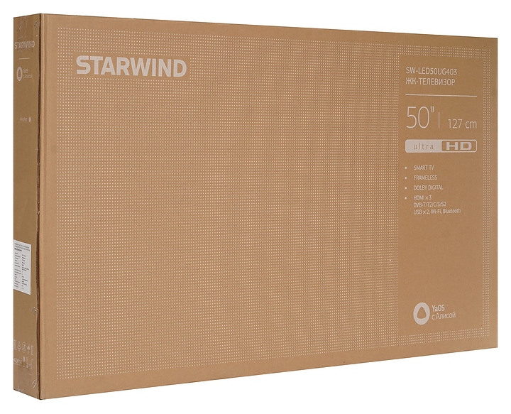 Телевизор Starwind SW LED50UG403 предназначен для приема и воспроизведения видео и аудио контента с различных ресурсов таких как телевещание, Интернет, дополнительное подключаемое оборудование и физические носители в домашних условиях, гостиницах, офисах, холлах и кабинетах различных учреждений. Прибор оснащен плоским монитором, акустической стереосистемой с 2 встроенными динамиками, встроенным блоком питания, кабелем питания с вилкой и основным выключателем, пульт – кнопочной клавиатурой. Кожух прибора выполнен из ударопрочного полимера с матовой поверхностью черного цвета, рамка и подставка – из пластика с поверхностью черного цвета, корпус пульта – из черного пластика.