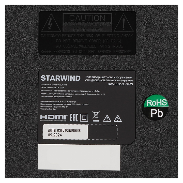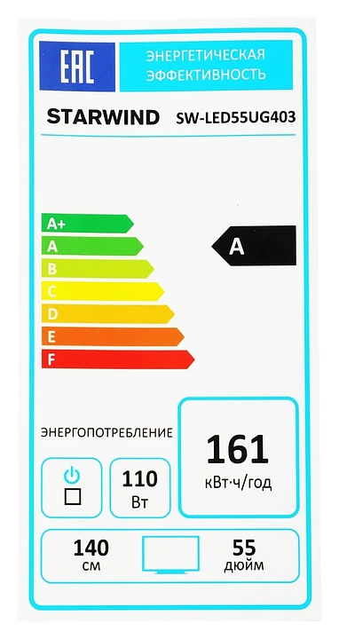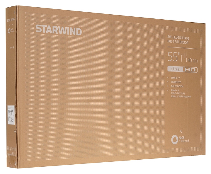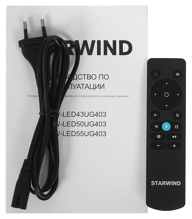 Телевизор Starwind SW LED55UG403 предназначен для приема и воспроизведения видео и аудио контента с различных ресурсов таких как телевещание, Интернет, дополнительное подключаемое оборудование и физические носители в домашних условиях, гостиницах, офисах, холлах и кабинетах различных учреждений. Прибор оснащен плоским монитором, акустической стереосистемой с 2 встроенными динамиками, встроенным блоком питания, кабелем питания с вилкой и основным выключателем, пульт – кнопочной клавиатурой. Кожух прибора выполнен из ударопрочного полимера с матовой поверхностью черного цвета, рамка и подставка – из пластика с поверхностью черного цвета, корпус пульта – из черного пластика.
