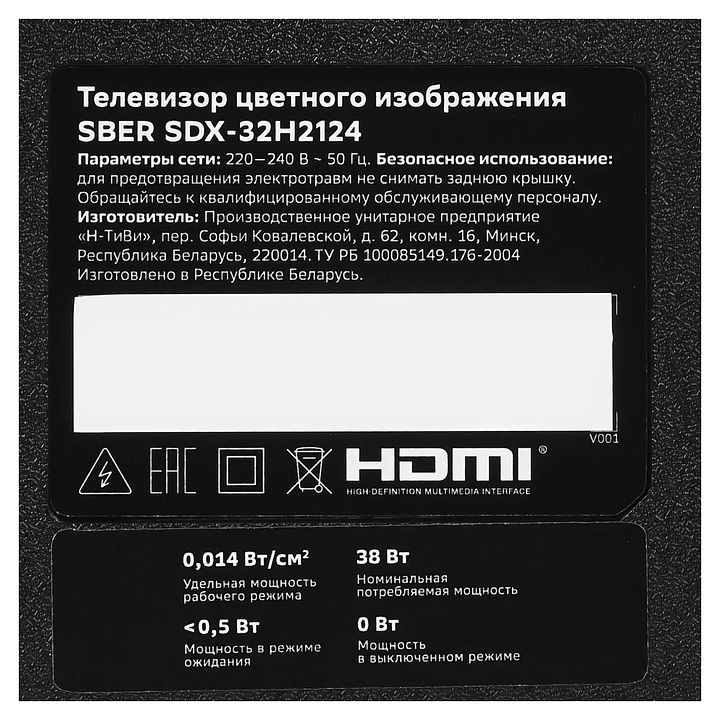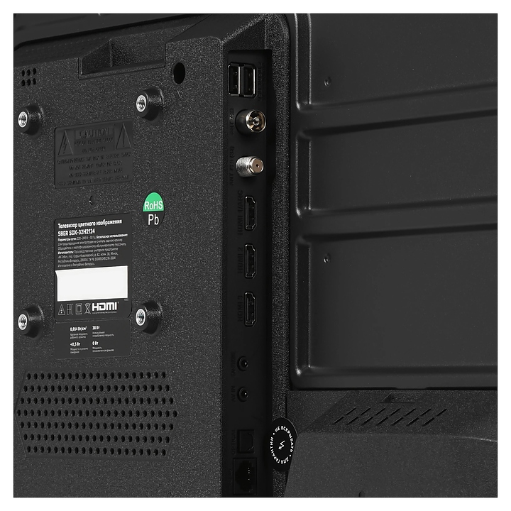 Телевизор Sber SDX-32H2124 предназначен для приема и воспроизведения видео и аудио контента с различных ресурсов таких как телевещание, Интернет, дополнительное подключаемое оборудование и физические носители в домашних условиях, гостиницах, офисах, холлах и кабинетах различных учреждений. Прибор оснащен плоским широкоформатным монитором, акустической стереосистемой с 2 встроенными динамиками, встроенным блоком питания, кабелем питания с вилкой и основным выключателем, пульт – кнопочной клавиатурой. Кожух прибора выполнен из ударопрочного полимера с матовой поверхностью черного цвета, рамка экрана и подставка – из пластика с поверхностью черного цвета, корпус пульта – из черного пластика.