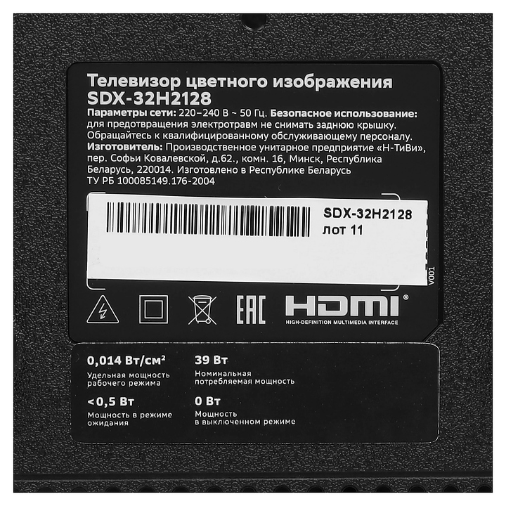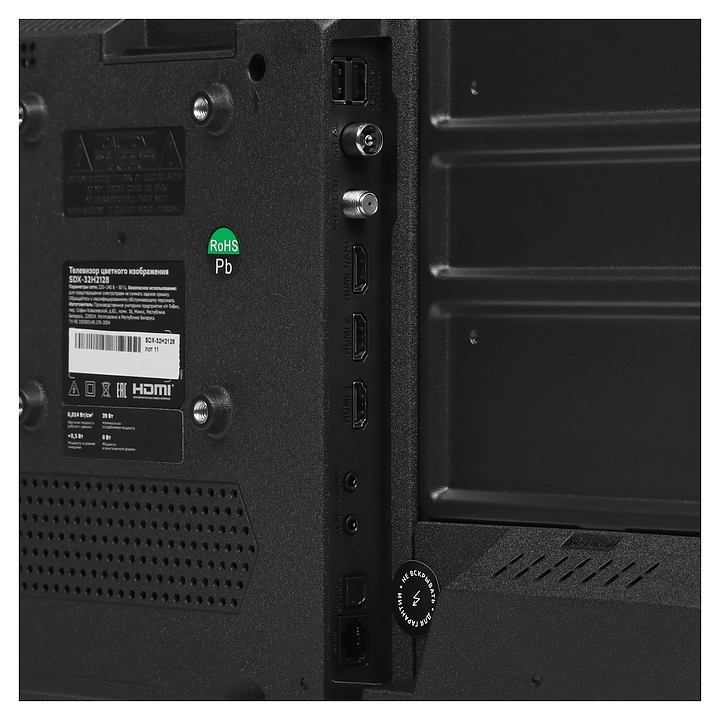 Телевизор Sber SDX-32H2128 предназначен для приема и воспроизведения видео и аудио контента с различных ресурсов таких как телевещание, Интернет, дополнительное подключаемое оборудование и физические носители в домашних условиях, гостиницах, офисах, холлах и кабинетах различных учреждений. Прибор оснащен плоским широкоформатным монитором, акустической стереосистемой с 2 встроенными динамиками, встроенным блоком питания, кабелем питания с вилкой и основным выключателем, пульт – кнопочной клавиатурой. Кожух прибора выполнен из ударопрочного полимера с матовой поверхностью черного цвета, рамка экрана и подставка – из пластика с поверхностью черного цвета, корпус пульта – из черного пластика.
