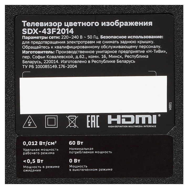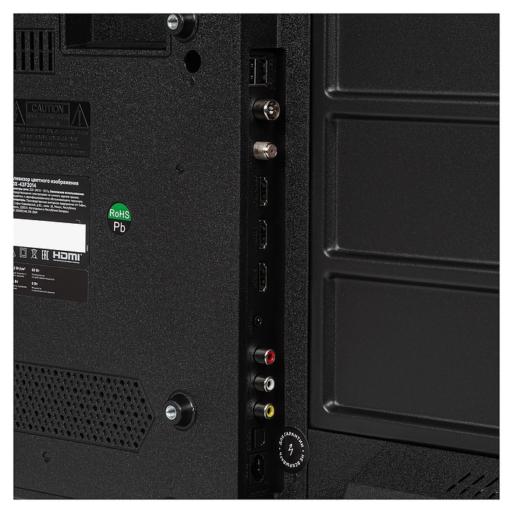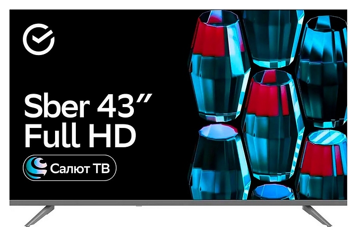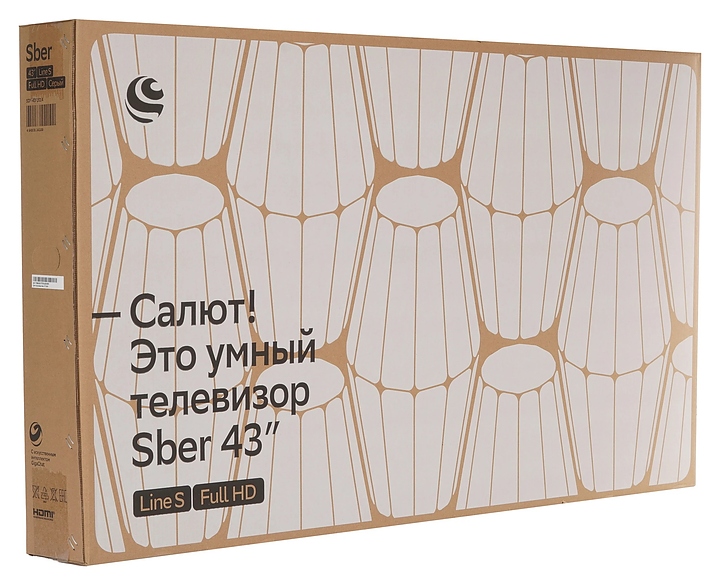 Телевизор Sber SDX-43F2014 предназначен для приема и воспроизведения видео и аудио контента с различных ресурсов таких как телевещание, Интернет, дополнительное подключаемое оборудование и физические носители в домашних условиях, гостиницах, офисах, холлах и кабинетах различных учреждений. Прибор оснащен плоским широкоформатным монитором, акустической стереосистемой с 2 встроенными динамиками, встроенным блоком питания, кабелем питания с вилкой и основным выключателем, пульт – кнопочной клавиатурой. Кожух прибора выполнен из ударопрочного полимера с матовой поверхностью черного цвета, рамка экрана и подставка – из пластика с поверхностью серебристого оттенка, корпус пульта – из черного пластика.