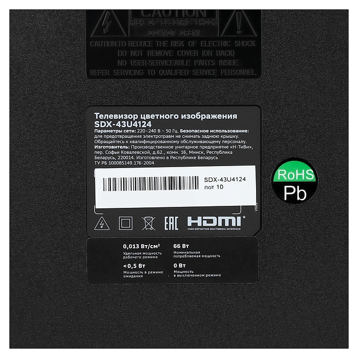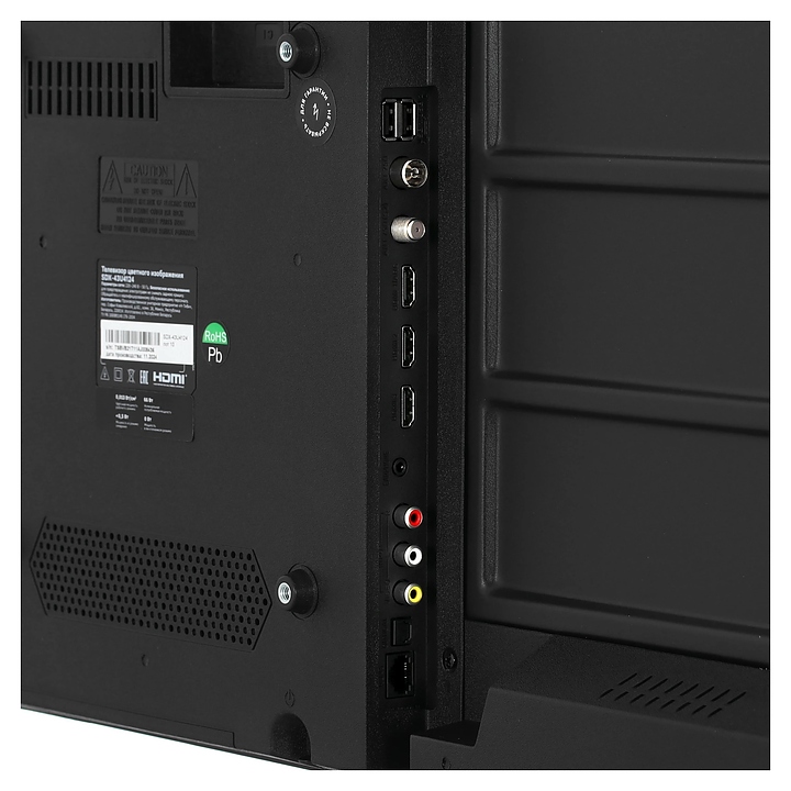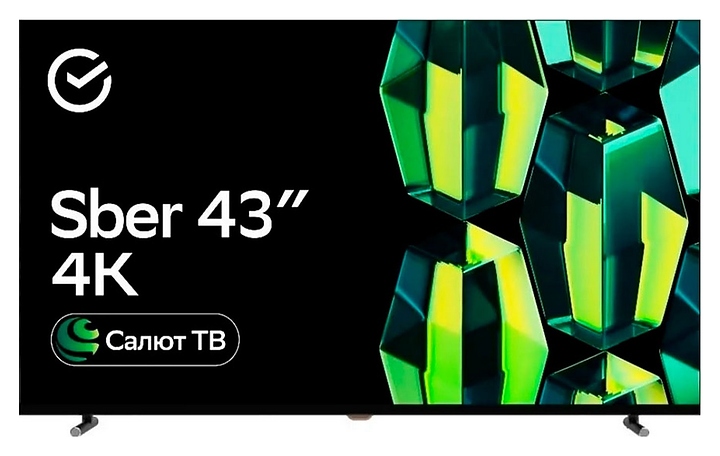 Телевизор Sber SDX-43U4124 предназначен для приема и воспроизведения видео и аудио контента с различных ресурсов таких как телевещание, Интернет, дополнительное подключаемое оборудование и физические носители в домашних условиях, гостиницах, офисах, холлах и кабинетах различных учреждений. Прибор оснащен плоским широкоформатным монитором, акустической стереосистемой с 2 встроенными динамиками, встроенным блоком питания, кабелем питания с вилкой и основным выключателем, пульт – кнопочной клавиатурой. Кожух прибора выполнен из ударопрочного полимера с матовой поверхностью черного цвета, рамка экрана и подставка – из пластика с поверхностью черного цвета, корпус пульта – из черного пластика.
