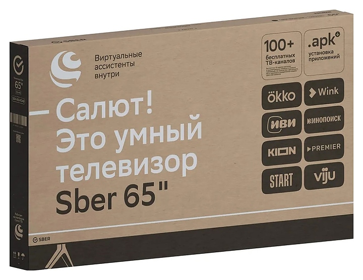 Телевизор Sber SDX-65U4124B предназначен для приема и воспроизведения видео и аудио контента с различных ресурсов таких как телевещание, Интернет, дополнительное подключаемое оборудование и физические носители в домашних условиях, гостиницах, офисах, холлах и кабинетах различных учреждений. Прибор оснащен плоским широкоформатным монитором, акустической стереосистемой с 2 встроенными динамиками, встроенным блоком питания, кабелем питания с вилкой и основным выключателем, пульт – кнопочной клавиатурой. Кожух прибора выполнен из ударопрочного полимера с матовой поверхностью черного цвета, фронтальная рамка – из металла, подставка с поверхностью черного цвета, корпус пульта – из черного пластика.