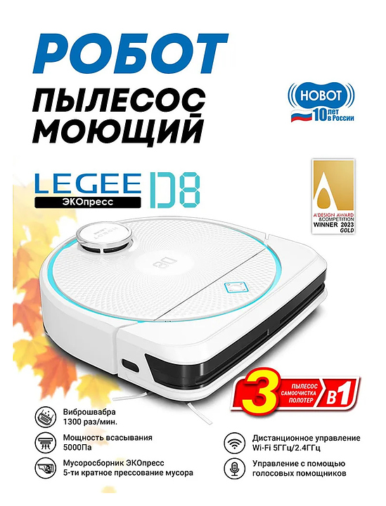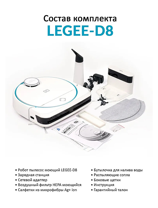 Робот пылесос моющий Hobot Legee-D8 эффективно очищает как сухие полы, так и ковры, идеально подходит семьям, ценящим гигиену и простоту, он справляется с пылью и остатками пищи, продлевая свежесть напольных покрытий. Модель оснащена виброшваброй, регулировкой мощности и мусоросборником ЭКОпресс. Корпус изготовлен из прочного пластика. В комплект поставки входят робот-пылесос моющий LEGEE-D8, зарядная станция, сетевой адаптер, бутылочка для налива воды, салфетки из микрофибры Ag+ion (2 шт.), распыляющие сопла (4 шт.), боковые щетки (3 шт.), воздушный фильтр HEPA моющийся (1 шт.), инструмент для чистки, инструкция и гарантийный талон. Особенности: