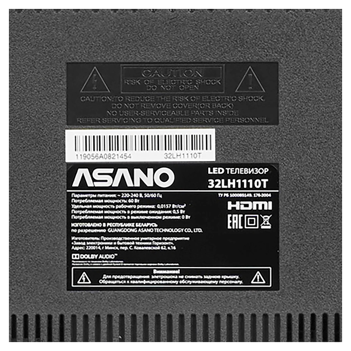 Телевизор Asano 32LH1110T предназначен для приема и воспроизведения видео и аудио контента с различных ресурсов таких как телевещание, дополнительное подключаемое оборудование и физические носители в домашних условиях, гостиницах, офисах, холлах и кабинетах различных учреждений. Прибор оснащен плоским широкоформатным монитором, акустической стереосистемой с 2 встроенными динамиками, встроенным блоком питания, кабелем питания с вилкой и основным выключателем, пульт – кнопочной клавиатурой. Кожух прибора выполнен из ударопрочного полимера с матовой поверхностью черного цвета, рамка экрана и подставка с поверхностью черного цвета, корпус пульта – из черного пластика.