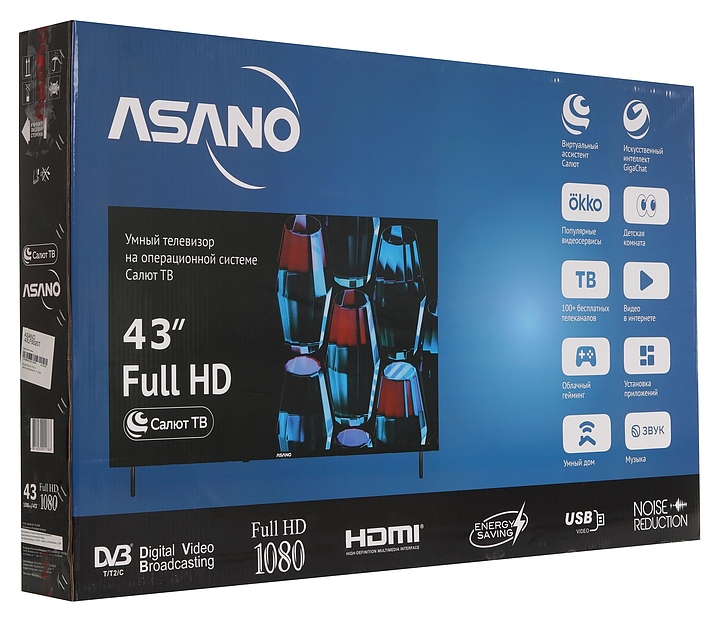 Телевизор Asano 43LF5020T предназначен для приема и воспроизведения видео и аудио контента с различных ресурсов таких как телевещание, Интернет, дополнительное подключаемое оборудование и физические носители в домашних условиях, гостиницах, офисах, холлах и кабинетах различных учреждений. Прибор оснащен плоским широкоформатным монитором, акустической стереосистемой с 2 встроенными динамиками, встроенным блоком питания, кабелем питания с вилкой и клавишами управления, пульт – кнопочной клавиатурой. Кожух прибора выполнен из ударопрочного полимера с матовой поверхностью черного цвета, рамка экрана и подставка с поверхностью черного цвета, корпус пульта – из черного пластика.