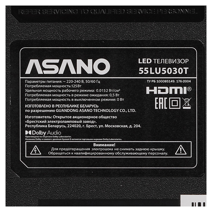 Телевизор Asano 55LU5030T предназначен для приема и воспроизведения видео и аудио контента с различных ресурсов таких как телевещание, Интернет, дополнительное подключаемое оборудование и физические носители в домашних условиях, гостиницах, офисах, холлах и кабинетах различных учреждений. Прибор оснащен плоским широкоформатным монитором, акустической стереосистемой с 2 встроенными динамиками, встроенным блоком питания, кабелем питания с вилкой и клавишами управления, пульт – кнопочной клавиатурой. Кожух прибора выполнен из ударопрочного полимера с матовой поверхностью черного цвета, рамка экрана и подставка с поверхностью черного цвета, корпус пульта – из белого пластика.