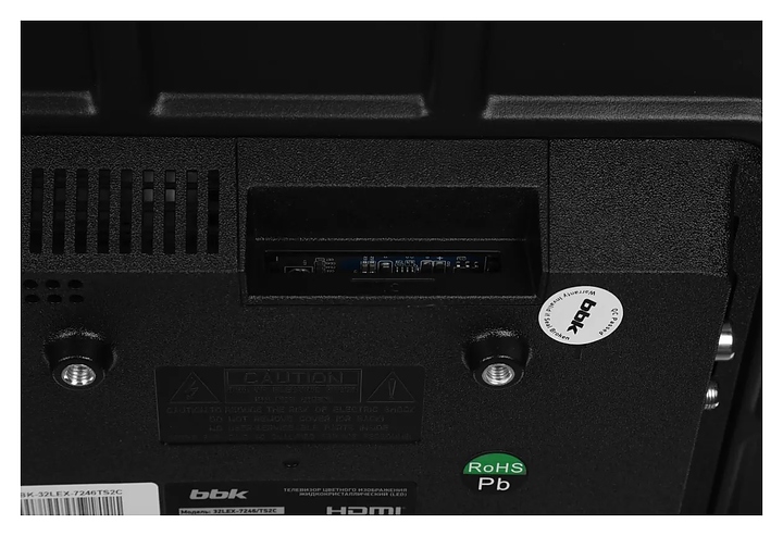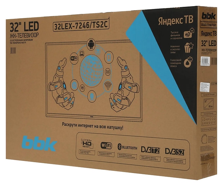 Телевизор BBK 32LEX-7246/TS2C предназначен для приема и воспроизведения видео и аудио контента с различных ресурсов таких как телевещание, Интернет, дополнительное подключаемое оборудование и физические носители в домашних условиях, гостиницах, офисах, холлах и кабинетах различных учреждений. Прибор оснащен плоским монитором, акустической стереосистемой с 2 встроенными динамиками, встроенным блоком питания, кабелем питания с вилкой и основным выключателем, пульт – кнопочной клавиатурой. Кожух прибора выполнен из ударопрочного полимера с матовой поверхностью черного цвета, рамка экрана и подставка – из пластика с поверхностью черного цвета, корпус пульта – из черного пластика.