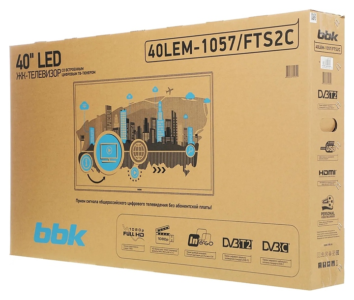 Телевизор BBK 40LEM-1057/FTS2C предназначен для приема и воспроизведения видео и аудио контента с различных ресурсов таких как телевещание, дополнительное подключаемое оборудование и физические носители в домашних условиях, гостиницах, офисах, холлах и кабинетах различных учреждений. Прибор оснащен плоским широкоформатным монитором, акустической стереосистемой с 2 встроенными динамиками, встроенным блоком питания и основным выключателем, пульт – кнопочной клавиатурой. Кожух прибора выполнен из ударопрочного полимера с матовой поверхностью черного цвета, рамка экрана и подставка – из пластика с поверхностью черного цвета, корпус пульта – из пластика в комбинации черного и серебристого тонов.