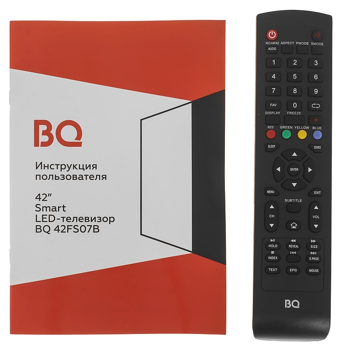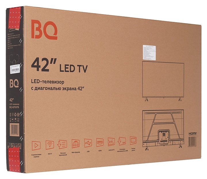Телевизор BQ 42FS07B предназначен для приема и воспроизведения видео и аудио контента с различных ресурсов таких как телевещание, Интернет, дополнительное подключаемое оборудование и физические носители в домашних условиях, гостиницах, офисах, холлах и кабинетах различных учреждений. Прибор оснащен плоским широкоформатным монитором, акустической стереосистемой с 2 встроенными динамиками, встроенным блоком питания, кабелем питания с вилкой и основным выключателем, пульт – кнопочной клавиатурой. Кожух прибора выполнен из ударопрочного полимера с матовой поверхностью черного цвета, рамка экрана и подставка – из пластика с поверхностью черного цвета, корпус пульта – из черного пластика.