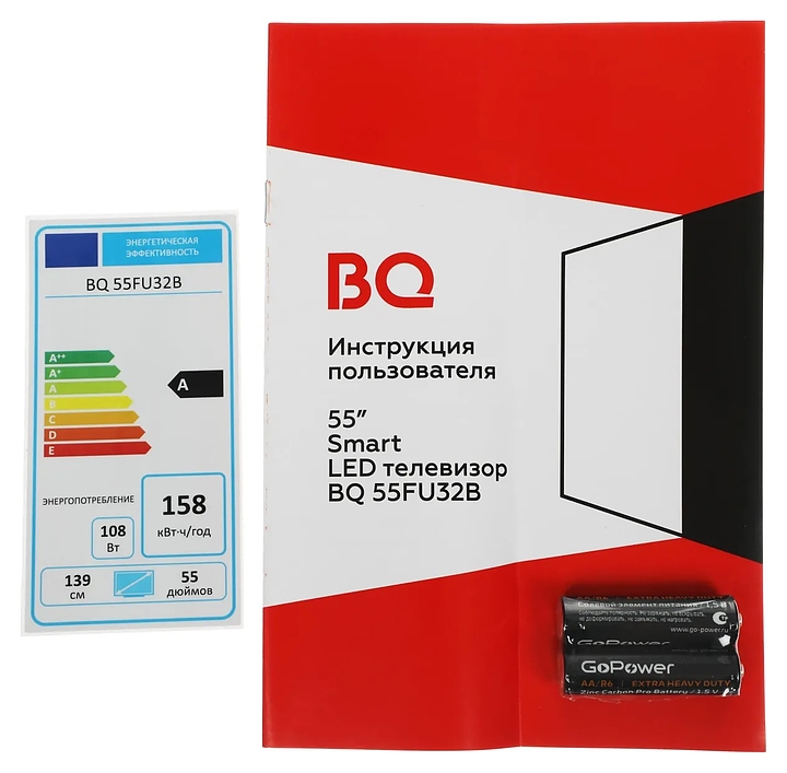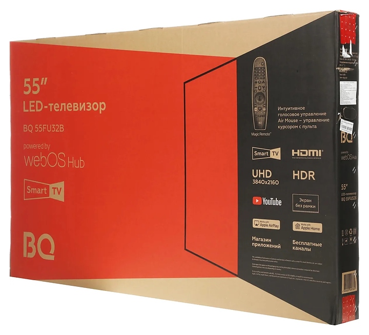 Телевизор BQ 55FU32B предназначен для приема и воспроизведения видео и аудио контента с различных ресурсов таких как телевещание, Интернет, дополнительное подключаемое оборудование и физические носители в домашних условиях, гостиницах, офисах, холлах и кабинетах различных учреждений. Прибор оснащен плоским широкоформатным монитором, акустической стереосистемой с 2 встроенными динамиками, встроенным блоком питания, кабелем питания с вилкой и клавишами управления, пульт – кнопочной клавиатурой и колесом прокрутки. Кожух прибора выполнен из ударопрочного полимера с матовой поверхностью черного цвета, подставка – из металла с поверхностью черного цвета, корпус пульта – из черного пластика.