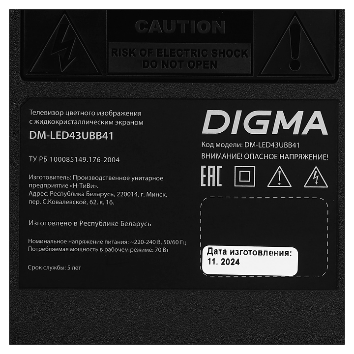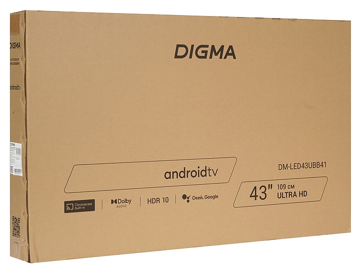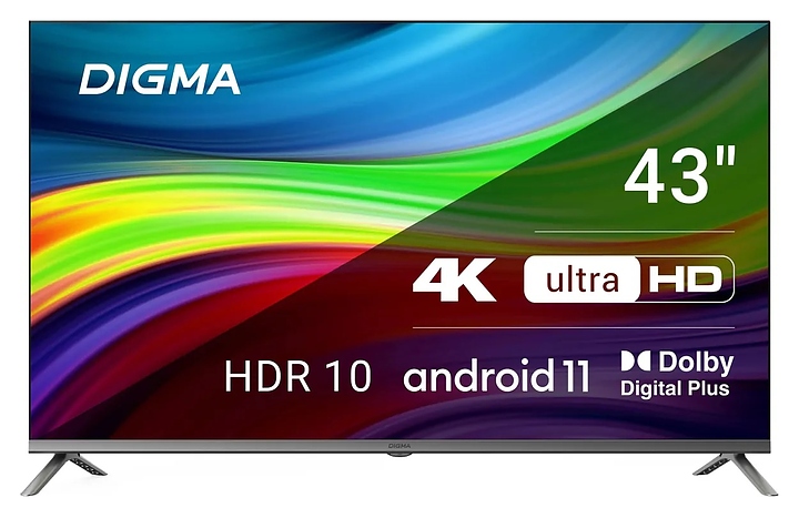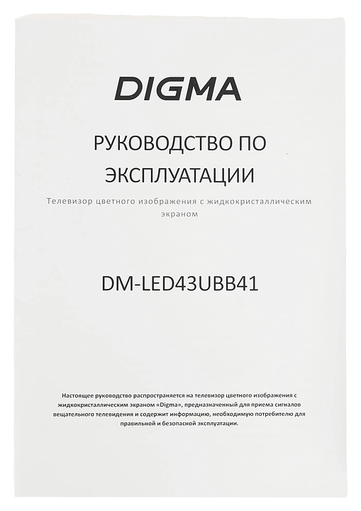 Телевизор Digma DM-LED43UBB41 предназначен для приема и воспроизведения видео и аудио контента с различных ресурсов таких как телевещание, Интернет, дополнительное подключаемое оборудование и физические носители в домашних условиях, гостиницах, офисах, холлах и кабинетах различных учреждений. Прибор оснащен плоским монитором, акустической стереосистемой с 2 встроенными динамиками, встроенным блоком питания, кабелем питания с вилкой и основным выключателем, пульт – кнопочной клавиатурой. Кожух прибора выполнен из ударопрочного полимера с матовой поверхностью черного цвета, рамка экрана с поверхностью серого оттенка, подставка с поверхностью темно-серебристого оттенка, корпус пульта – из черного пластика.