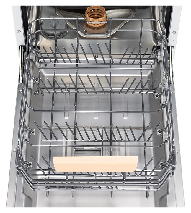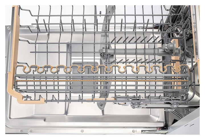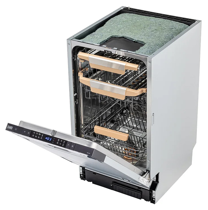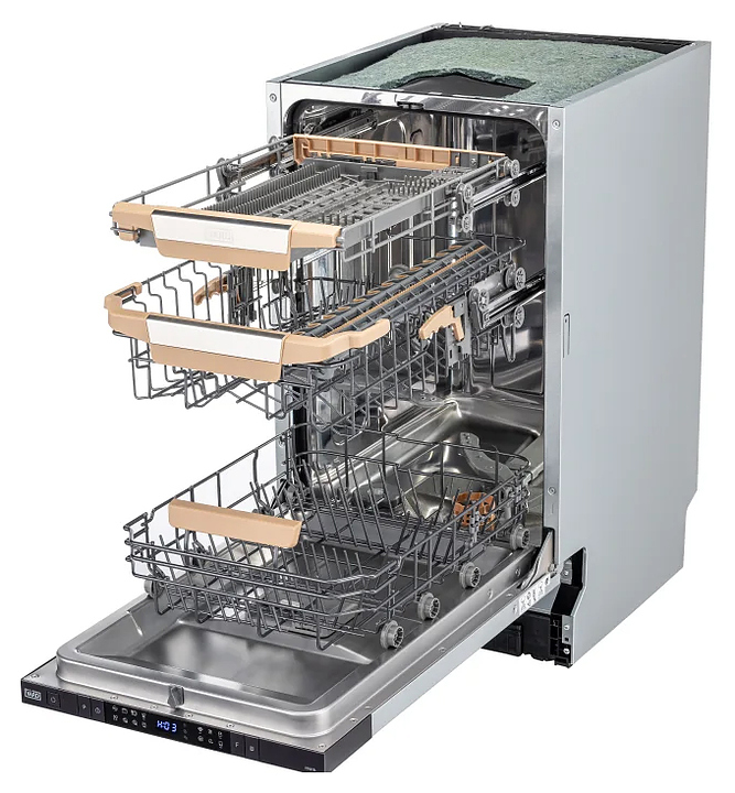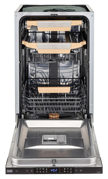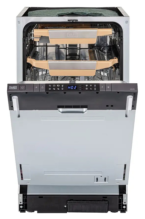 Посудомоечная машина VARD VDI413L предназначена для гигиенической обработки и последующей сушки различной посуды в домашних условиях. Модель оснащена моечной камерой с откидной дверью, корзиной для столовых приборов SpaceMax и инверторным мотором. В конце программы машина обдает моющиеся предметы горячей водой и открывает дверцу, из-за перепада температур на посуде образуется конденсат, который быстро стекает, а посуда становится сухой естественным путем. Защитные силиконовые держатели позволяют зафиксировать бокалы в корзине, предотвращая их повреждение в процессе мойки. Луч на полу показывает, что посудомоечная машина работает и цикл не завершен. Автопрограмма использует датчики мутности воды для определения длительности мойки и температуры воды. Особенности:
