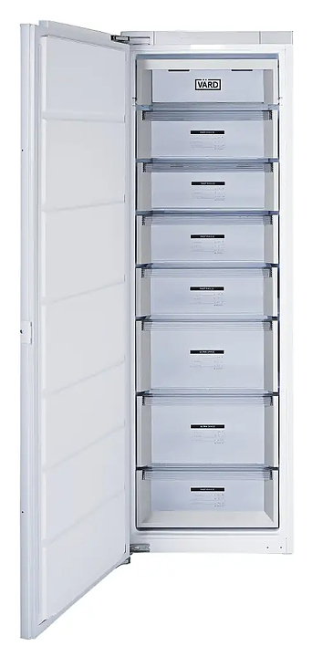 Встраиваемый морозильник VARD VFI177NIW предназначен для замораживания, кратковременного и длительного хранения продуктов питания в частных домах, квартирах, отелях и офисах. Модель оснащена 4 полками, 8 ящиками и внутренним LED-освещением. Одновременное использование инверторных компрессора и вентилятора обеспечивают тихую, экономичную и надежную работу. Интеллектуальное управление воздушными потоками AI Cooling в камере динамически регулирует их температуру и интенсивность в соответствии с заданными настройками. Система No Frost не требует размораживания камеры, потоки воздуха распределяются равномерно и исключают перепады температур. Полки выполнены из закаленного стекла. Особенности: