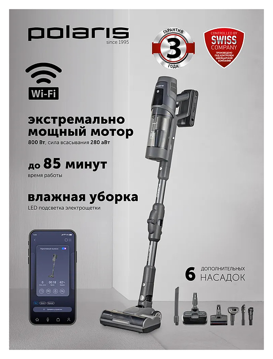 Пылесос вертикальный беспроводной Polaris PVCS 6020 Cyclonic Way PRO Wi-Fi IQ Home графитовый