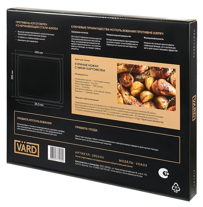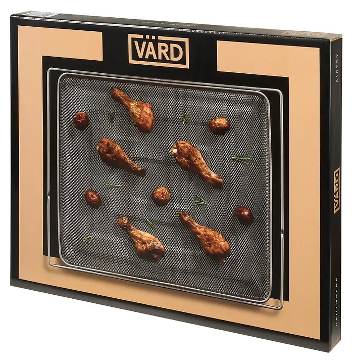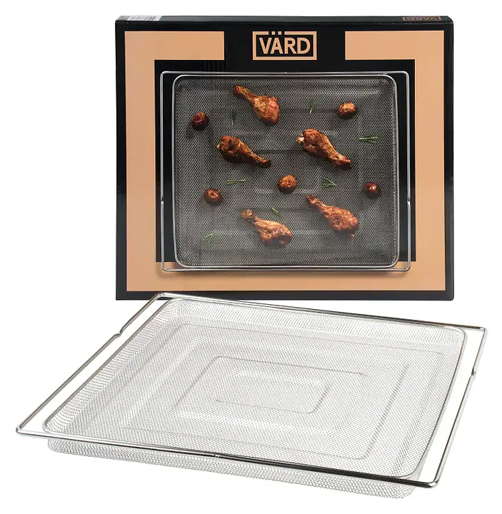 Лоток-противень VARD AirFry VOA02 используется с духовым шкафом для жарки продуктов, сушки овощей и фруктов. Сетчатая структура способствует равномерному приготовлению блюда. Изделие выполнено из пищевой стали AISI 304, которая отличается долговечностью, устойчивостью к коррозии и легкой очисткой. Характеристики: