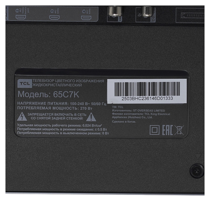 Телевизор TCL 65C7K предназначен для приема и воспроизведения видео и аудио контента с различных ресурсов таких как телевещание, Интернет, дополнительное подключаемое оборудование и физические носители в домашних условиях, гостиницах, офисах, холлах и кабинетах различных учреждений. Прибор оснащен широкоформатным плоским монитором, акустической стереосистемой с 2 встроенными динамиками и 2 сабвуферами, встроенным блоком питания, кабелем питания с вилкой и основным выключателем, пульт – кнопочной клавиатурой. Кожух прибора выполнен из ударопрочного полимера с матовой поверхностью черного цвета, рамка экрана – из металла, подставка с поверхностью черного цвета, корпус пульта – из черного пластика.