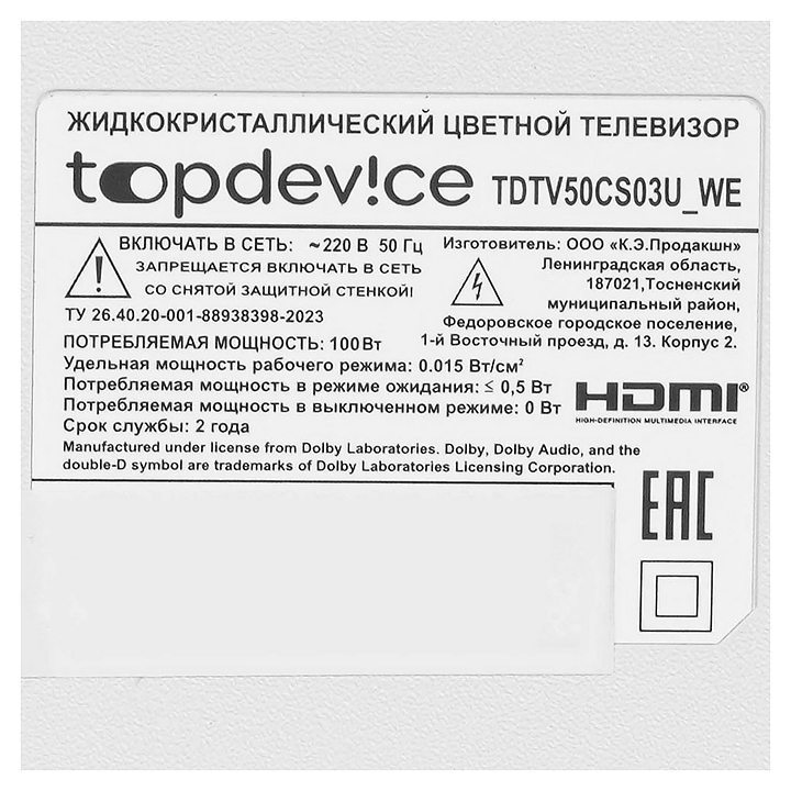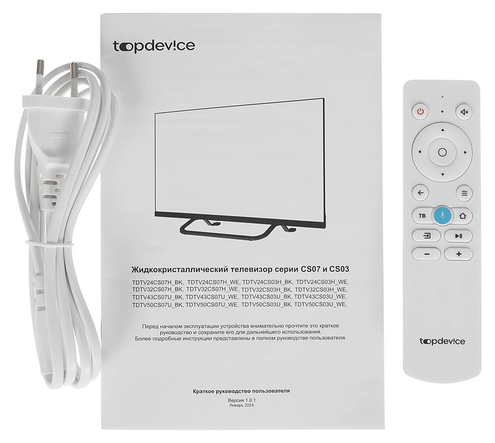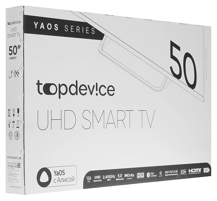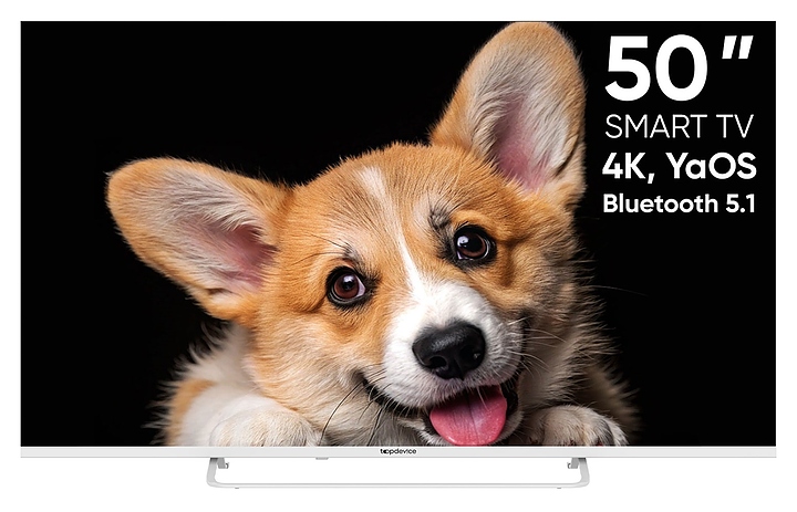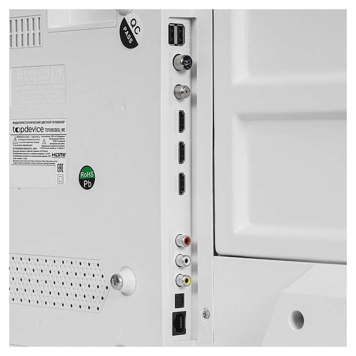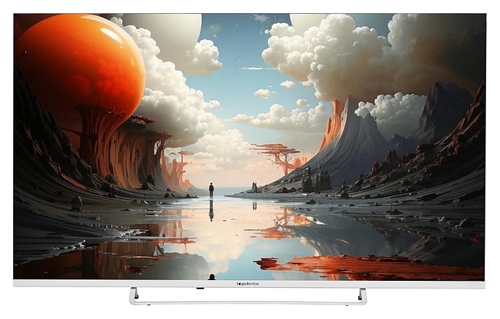 Телевизор Topdevice TDTV50CS03U_WE предназначен для приема и воспроизведения видео и аудио контента с различных ресурсов таких как телевещание, Интернет, дополнительное подключаемое оборудование и физические носители в домашних условиях, гостиницах, офисах, холлах и кабинетах различных учреждений. Прибор оснащен плоским широкоформатным монитором, акустической стереосистемой с 2 встроенными динамиками, встроенным блоком питания и основным выключателем, пульт – кнопочной клавиатурой. Кожух прибора выполнен из ударопрочного полимера (HIPS) с матовой поверхностью белого цвета, рамка экрана и подставка с поверхностью белого цвета, корпус пульта – из белого пластика.
