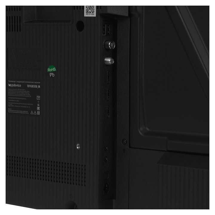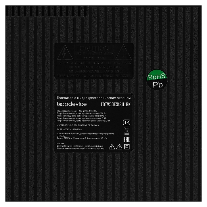 Телевизор Topdevice TDTV50ES13U_BK предназначен для приема и воспроизведения видео и аудио контента с различных ресурсов таких как телевещание, Интернет, дополнительное подключаемое оборудование и физические носители в домашних условиях, гостиницах, офисах, холлах и кабинетах различных учреждений. Прибор оснащен плоским широкоформатным монитором, акустической стереосистемой с 2 встроенными динамиками, встроенным блоком питания и основным выключателем, пульт – кнопочной клавиатурой. Кожух прибора выполнен из ударопрочного полимера (HIPS) с матовой поверхностью черного цвета, рамка экрана и подставка с поверхностью черного цвета, корпус пульта – из черного пластика.