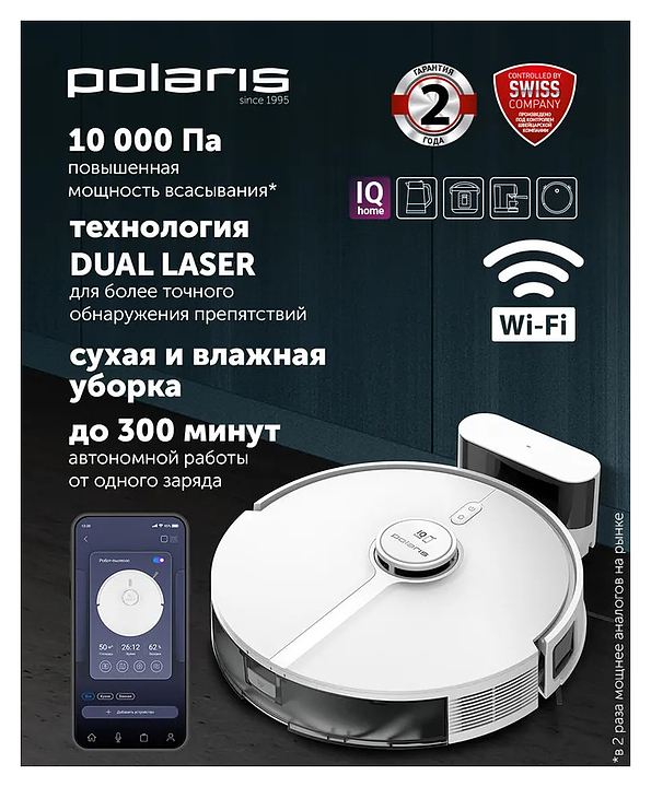 Умный робот пылесос Polaris PVCR 5005 WIFI IQ Home созданный для сухой, влажной и комбинированной уборки, обеспечивает идеальную чистоту в вашем доме. Устройство оснащено системой построения до 10 карт помещения и возможностью управления через смартфон, а также голосовыми помощниками. В комплект входит: