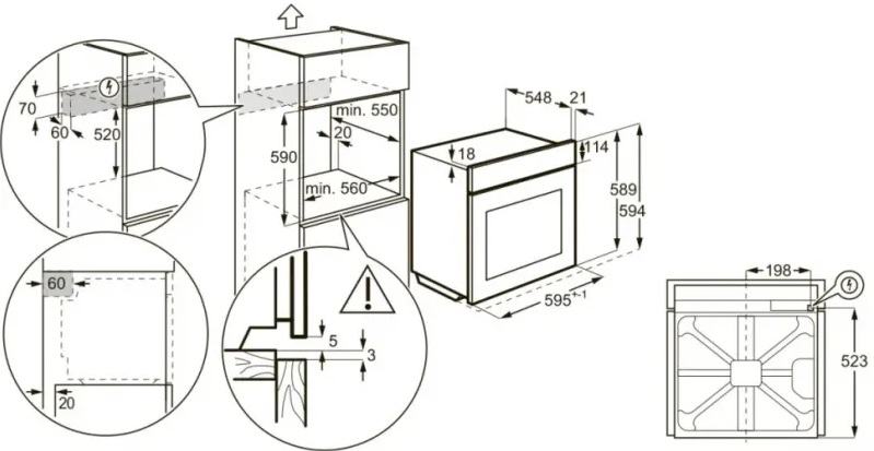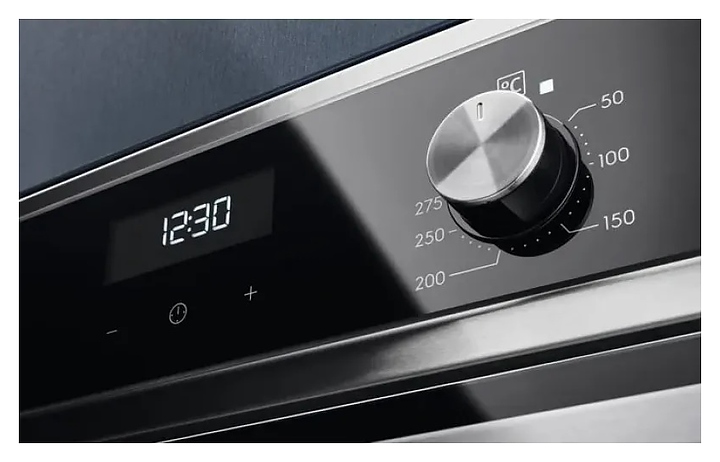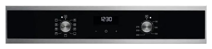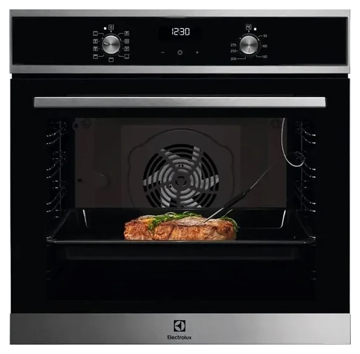 Встраивамый электрический духовой шкаф Electrolux EOF5F70X предназначен для приготовления большого ассортимента блюд в домашних условиях. Модель оснащена камерой с расположенными в задней стенке кольцевым нагревательным элементом и вентилятором, верхним и нижним нагревательными элементами, верхним грилем, 2 боковыми стойками с 5 уровнями направляющих для противней, откидной дверью со смотровым окном, уплощенной горизонтальной рукояткой, кабелем питания с евровилкой (Shuko), расположенной в верхней части фронта панелью управления с 2 цилиндрическими поворотными переключателями, сенсорными функциональными клавишами и светодиодным дисплеем с белой подсветкой индикации. Корпус выполнен из высококачественной стали, фронт двери и верхней панели с покрытием черного цвета и частичным остеклением без винтового крепежа прозрачным закаленным стеклом, боковые стойки, направляющие и решетка для гриля – из металла с хромированной поверхностью, противни – из металла с эмалированным покрытием, рукоятка, переключатели и декоративные фронтальные рамки – из металла с матовой поверхностью цвета нержавеющей стали.