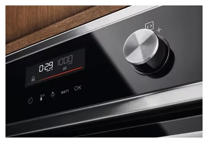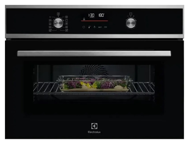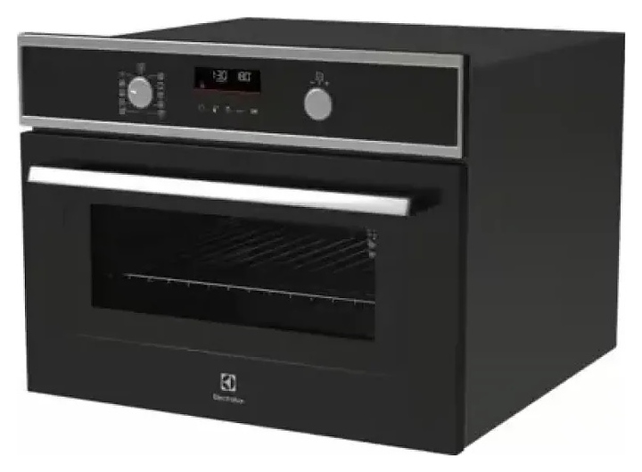 Встраиваемая микроволновая печь Electrolux EVL6E49X предназначена для приготовления большого ассортимента блюд в домашних условиях. Модель оснащена рабочей камерой с магнетроном, расположенными в задней стенке кольцевым нагревательным элементом и вентилятором, верхним и нижним нагревательными элементами, верхним тэновым грилем, 2 боковыми стойками с 3 уровнями направляющих для противней, откидной дверью со смотровым окном и горизонтальной рукояткой, кабелем питания, расположенной в верхней части фронта электромеханической панелью управления с 2 цилиндрическими поворотными переключателями, сенсорными функциональными клавишами и дисплеем с символьными и цифровыми сегментами индикации. Корпус выполнен из высококачественной стали, фронт двери и верхней панели с покрытием черного цвета и остеклением без винтового крепежа прозрачным закаленным стеклом, боковые стойки и решетка для гриля – из металла с хромированной поверхностью, противень для выпекания – из металла с эмалированным покрытием, рукоятка, переключатели и декоративные фронтальные рамки – из металла с матовой поверхностью цвета нержавеющей стали.