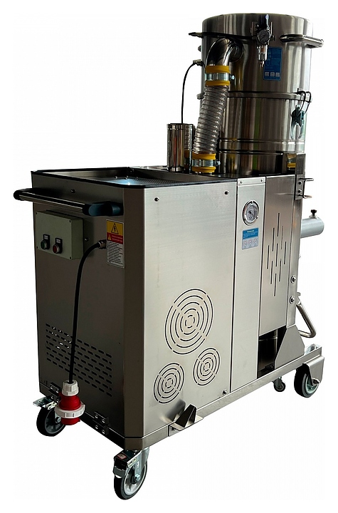Индустриальный пылеводосос EVOline 1100 7,5 kW AUTO предназначен для сухой и влажной уборки в ходе ремонтно-строительных или реставрационных работ, очистки автомобильных салонов, мягкой мебели и напольного покрытия на предприятиях пищевой, металлообрабатывающей и других направлений промышленности, складах, в мастерских и производственных цехах. Модель оснащена расположенным с тыльной стороны коробом с моторным отсеком, панелью управления с нажимными клавишами, нагнетательным шлангом, цилиндрическими барабаном и баком, каркасной рамой с шасси и ведущей рукояткой. Барабан, бак и шумоглушитель выполнены из нержавеющей стали с полированной поверхностью, рама и короб моторного отсека – из нержавеющей стали с матовой поверхностью, ведущие рукоятки корпуса и бака – из профиля круглого сечения из нержавеющей стали, нагнетательный шланг – из прозрачного поливинилхлорида (ПВХ) с армированием металлической проволокой. Комплектация: