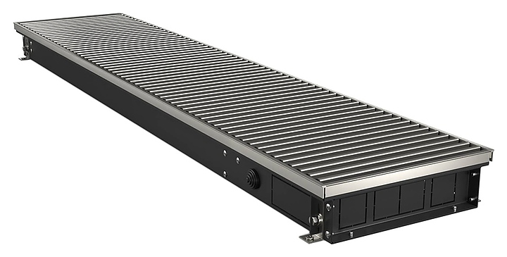 Конвектор Royal Thermo ATRIUM-75/250/1800-DG-U-NA предназначен для обогрева и поддержания комфортного микроклимата в жилых и служебных помещениях. Модель оснащена съемным пластинчато-трубным водяным теплообменником с резьбовыми соединительными патрубками: нагрев воздуха осуществляется путем циркуляции подаваемого в трубный контур теплоносителя, дальнейшей передачи тепла на оребрение и естественной конвекции. Корпус прямоугольного сечения выполнен из оцинкованной стали, трубы теплообменника – из меди, оребрение теплообменника – из алюминия, патрубки теплообменника – из латуни, ламели решетки – из алюминия с анодированной поверхностью оттенка натуральный алюминий, корпус и теплобменник с покрытием шагреневой краской AkzoNobel черного цвета Noir Sable. Комплектация:
