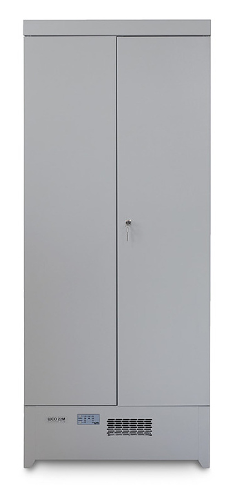 Сушильный шкаф КМК ЗАВОД ШСО-22М используется на производствах, в частных домах и квартирах для сушки мокрой одежды и обуви, предварительный отжим не требуется. Шкаф состоит из двух базовых элементов: верхней части корпуса шкафа и нижней подставки с встроенным блоком нагрева. Верхняя часть корпуса соединяется с подставкой с помощью стандартных метизов. Верхняя часть корпуса закрывается двумя дверьми, в одной из которых установлен почтовый замок, запирающий одновременно обе двери. Внутри верхняя часть корпуса снабжена шестью съемными сетчатыми полками. Нижняя подставка шкафа представляет собой рамную конструкцию, состоящую из передней и задней панелей, изготовленных из листовой стали, двух боковых и одной нижней рам, изготовленных из профильной трубы. В передней панели встроен блок нагрева. Упаковка: