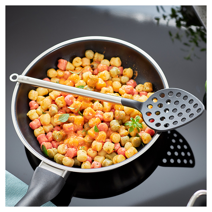 Шумовка ROESLE Basic Line 130704 используется на предприятиях общественного питания для съема накипи и пены с супов и других блюд, выемки мяса и рыбы из кипящей воды, а также в других целях. Модель оснащена удобной длинной ручкой с петлей на конце. Изделие можно мыть в посудомоечной машине. Ручка выполнена из нержавеющей стали 18/10, отличающейся прочностью и долговечностью, рабочая часть - из пластика, который защищает миски и сковороды от царапин. Дополнительные характеристики: