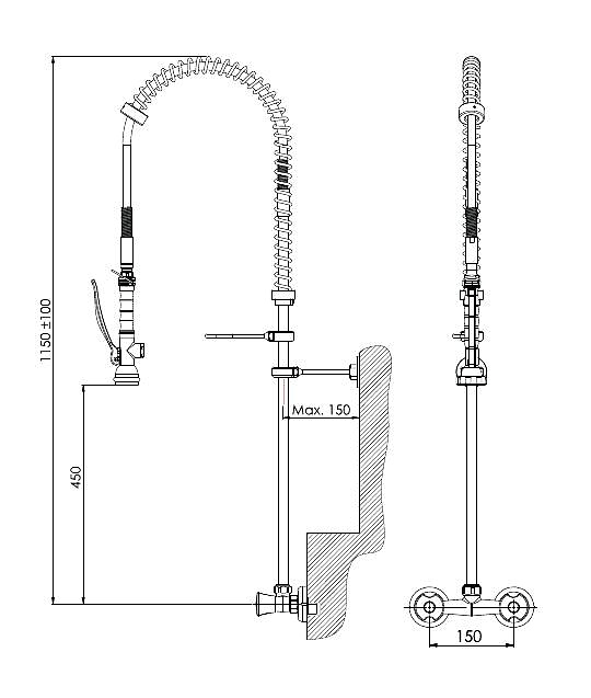 Душирующее устройство со смесителем T-LUX 105.021.609-1027 PRO предназначено для ежедневного использования с целью подачи воды оптимальной температуры, предварительного ополаскивания посуды, а также мойки фруктов и овощей на кухнях пекарен, столовых, кафе, ресторанов и других предприятий общественного питания. Корпус, смеситель и система крепления к стене выполнены из латуни с хромированной поверхностью, труба – из нержавеющей стали марки AISI304, гибкий душевой шланг – из этилен-пропиленового каучука (EPDM) с оплеткой из стали с хромированной поверхностью, прочие компоненты – из черного полимера. Комплектация: