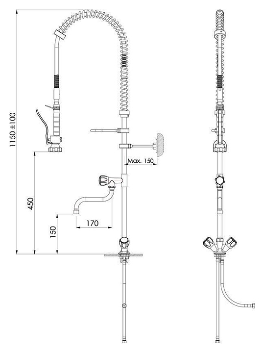 Душирующее устройство со смесителем T-LUX 105.021.003-1027 PREMIUM предназначено для ежедневного использования с целью подачи воды оптимальной температуры, предварительного ополаскивания посуды, а также мойки фруктов и овощей на кухнях пекарен, столовых, кафе, ресторанов и других предприятий общественного питания. Корпус, смеситель и система крепления к стене выполнены из латуни с хромированной поверхностью, труба – из нержавеющей стали марки AISI304, гибкий душевой шланг – из этилен-пропиленового каучука (EPDM) с оплеткой из стали с хромированной поверхностью, прочие компоненты – из черного полимера. Комплектация: