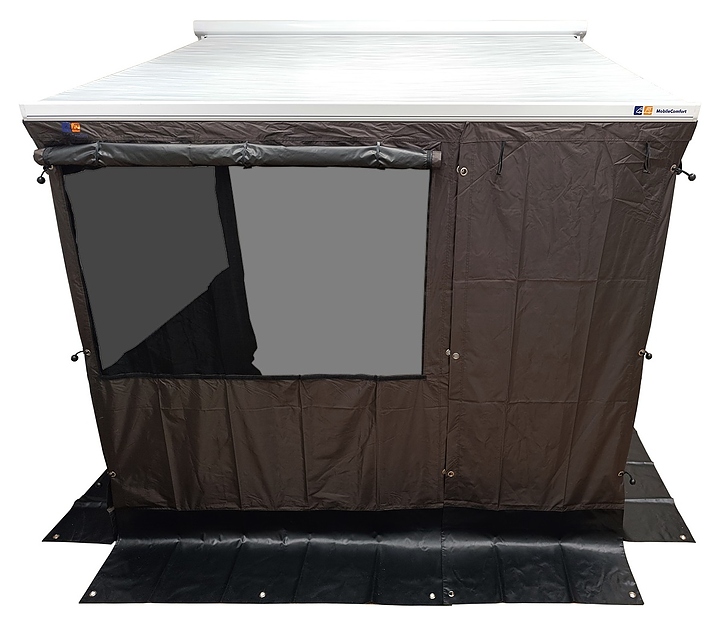 Палатка MobileComfort MS300 СТАНДАРТ используется совместно с автомобильными маркизами для создания комфортного жилого простраства на расположенной под тентом территории и надежной защиты от солнца, ветра, осадков и насекомых. Модель состоит из 3 полотен (фронтальной и боковых стенок), соединяемых с помощью застежек. Каждая стенка имеет окно с антимоскитной сеткой и откидным полотном на молнии, фронтальная стенка оснащена дверью во всю высоту в виде полотна с возможностью складывания вверх. Боковые стенки легко присоединяются к маркизе с помощью раздвижных рейлингов, устанавливаемых в пазы внутри корпуса маркизы, фронтальная часть палатки имеет вшитый кедер, который заводится в лик-паз в передней направляющей маркизы, а затем фронтальная и боковые панели соединяется между собой и крепятся к стойкам маркизы. Полотна выполнены из водонепроницаемой, устойчивой к ультрафиолетовому излучению и легко моющейся виниловой ткани.