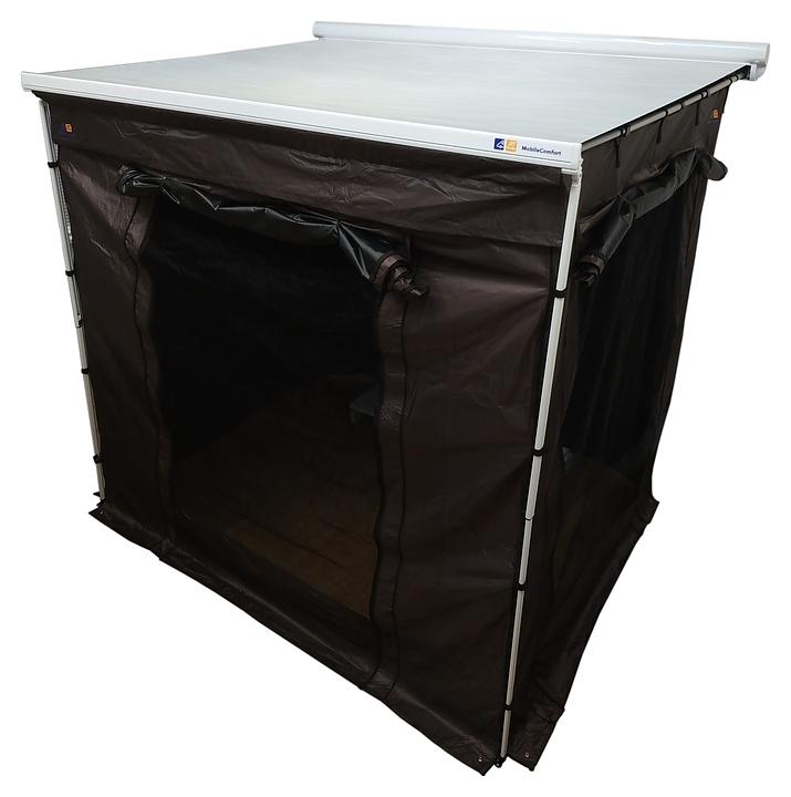 Палатка MobileComfort MR250 ПРЕМИУМ используется совместно с автомобильными маркизами для создания комфортного жилого простраства на расположенной под тентом территории и надежной защиты от солнца, ветра, осадков и насекомых. Модель состоит из 4 полотен (фронтальной, задней, боковых стенок и потолка), соединяемых с помощью застежек. Фронтальная и боковые стенки имеют дверь во всю высоту с антимоскитной сеткой и откидным полотном на молнии с возможностью складывания вверх. Боковые стенки легко присоединяются к маркизе с помощью раздвижных рейлингов, устанавливаемых в пазы внутри корпуса маркизы, фронтальная часть палатки имеет вшитый кедер, который заводится в лик-паз в передней направляющей маркизы, а затем фронтальная и боковые панели соединяется между с помощью молний. Полотна выполнены из водонепроницаемой, устойчивой к ультрафиолетовому излучению и легко моющейся виниловой ткани.