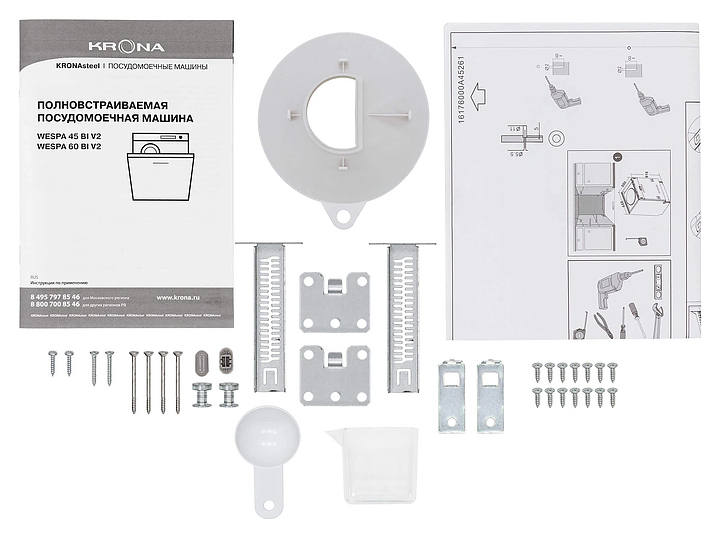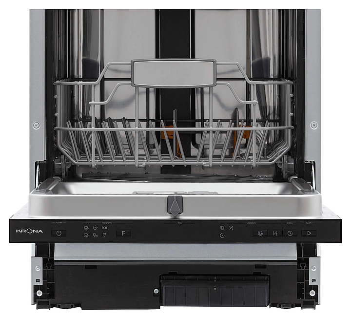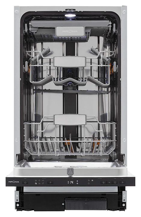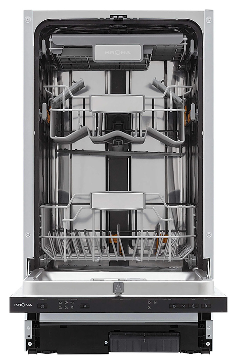 Встраиваемая посудомоечная машина Krona WESPA 45 BI V2 линейки OPTIMA предназначена для гигиенической обработки и последующей сушки различной посуды в гостиничных комплексах и домашних условиях. Модель оснащена камерой с откидной дверью с интегрированной рукояткой, 3 разбрызгивателями, дозаторами моющих и ополаскивающих средств, устройством умягчения воды, кабелем питания с вилкой, расположенной на верхнем торце двери электорнной панелью управления с функциональными нажимными клавишами, светодиодными сигнальными лампами и цифровым дисплеем с белой подсветкой индикации. Внутренняя облицовка камеры и двери выполнена из высококачественной нержавеющей стали, панель управления – из полимера черного цвета.