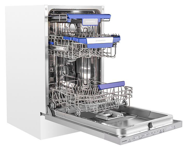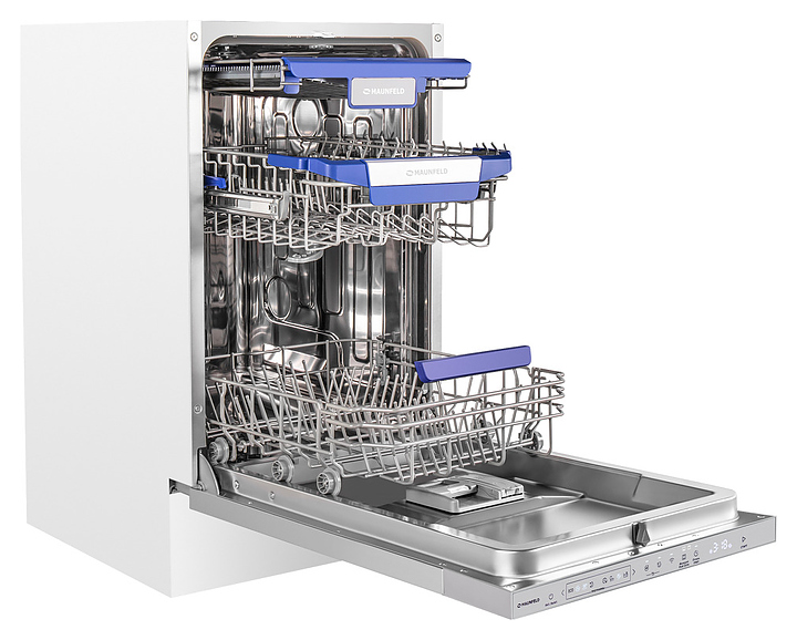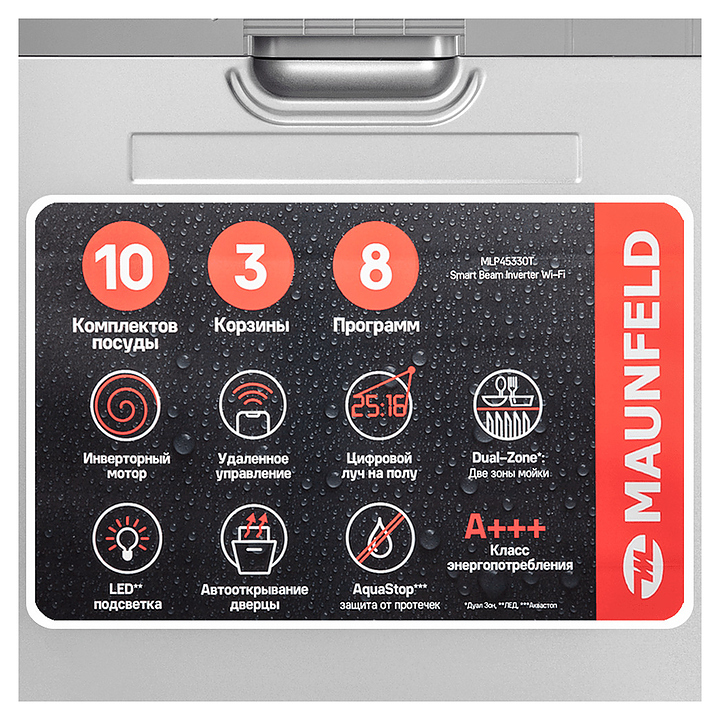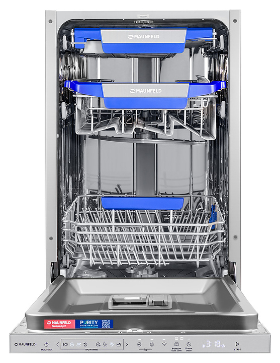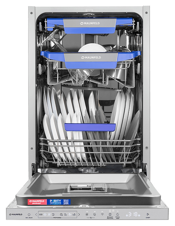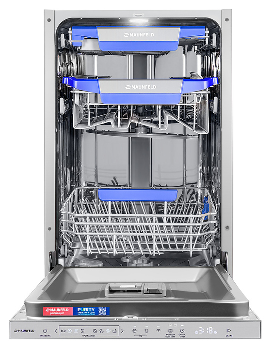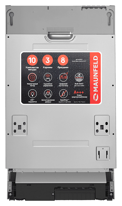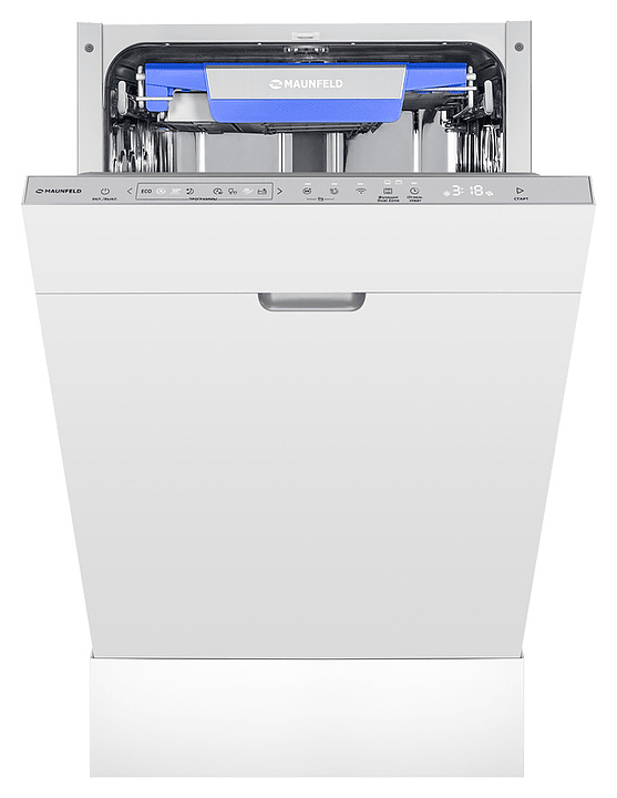 Встраиваемая посудомоечная машина Maunfeld MLP45330T Smart Beam Inverter Wi-Fi предназначена для гигиенической обработки и последующей сушки различной посуды в гостиничных комплексах и домашних условиях. Модель оснащена камерой с откидной дверью с интегрированной рукояткой, 3 разбрызгивателями, дозаторами моющих и ополаскивающих средств, устройством умягчения воды, кабелем питания с вилкой, расположенной на верхнем торце двери электронной панелью управления с функциональными сенсорными клавишами, светодиодными сигнальными лампами и цифровым дисплеем с белой подсветкой индикации. Внутренняя облицовка камеры и двери выполнена из высококачественной нержавеющей стали, корпус – из металла с антикоррозийным покрытием.