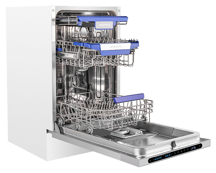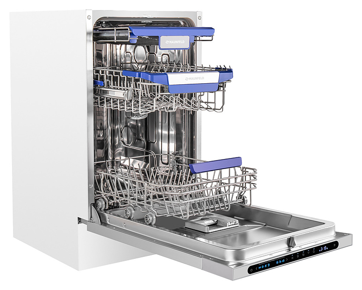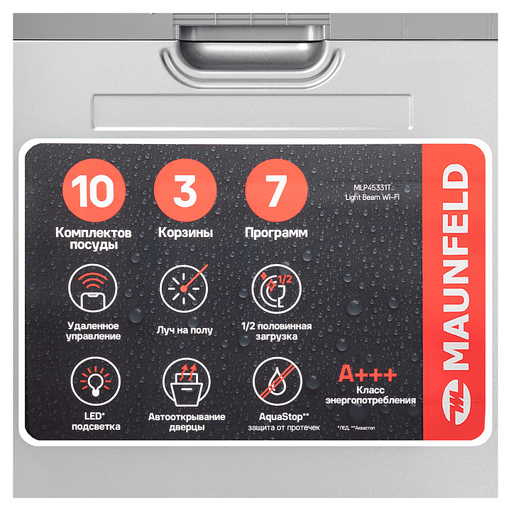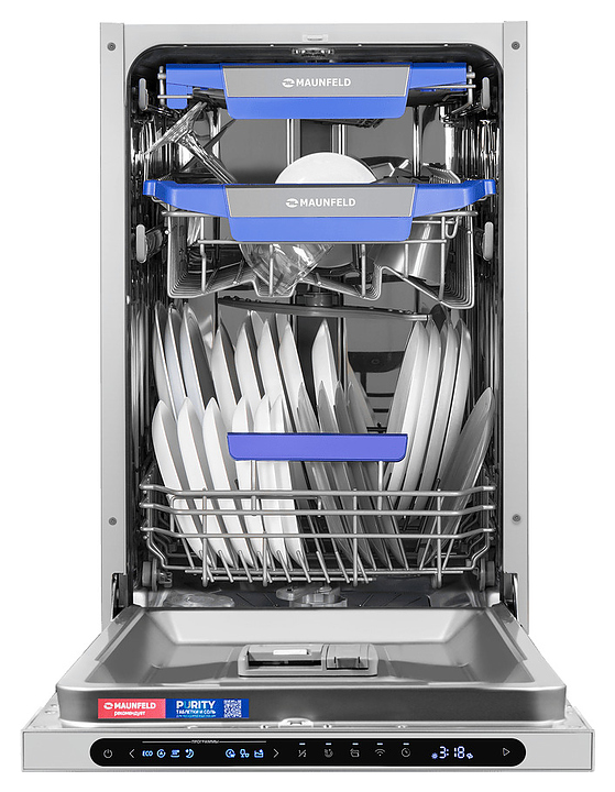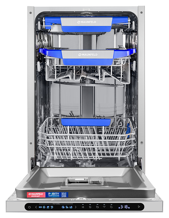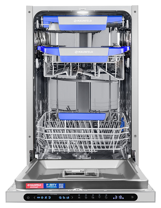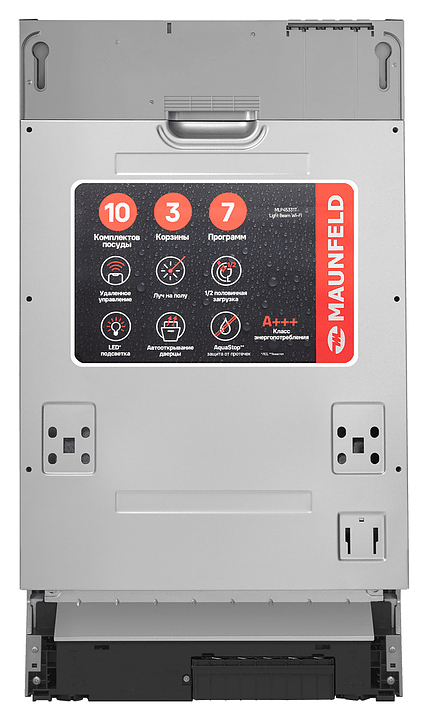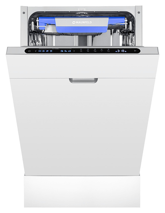 Встраиваемая посудомоечная машина Maunfeld MLP45331T Light Beam Wi-Fi предназначена для гигиенической обработки и последующей сушки различной посуды в гостиничных комплексах и домашних условиях. Модель оснащена камерой с откидной дверью с интегрированной рукояткой, 3 разбрызгивателями, дозаторами моющих и ополаскивающих средств, устройством умягчения воды, кабелем питания с вилкой, расположенной на верхнем торце двери электронной панелью управления с функциональными сенсорными клавишами, светодиодными сигнальными лампами и цифровым дисплеем с голубой подсветкой индикации. Внутренняя облицовка камеры и двери выполнена из высококачественной нержавеющей стали, корпус – из металла с антикоррозийным покрытием, панель управления – из полимера черного цвета.