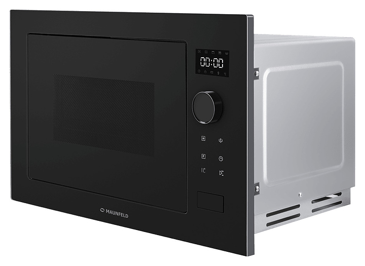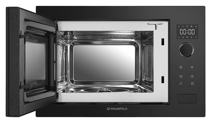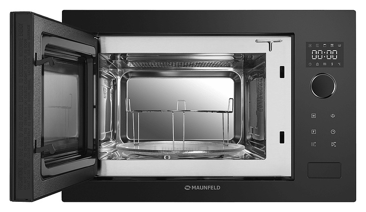Встраиваемая микроволновая печь Maunfeld XBMO251GB Matt предназначена для приготовления различных блюд, подогрева готовых блюд и ингредиентов, а также размораживания полуфабрикатов в гостиницах, офисах и домашних условиях. Модель оснащена камерой с верхним тэновым грилем, левосторонней распашной дверью со смотровым окном, кабелем питания с вилкой, расположенной с правой стороны фронта электромеханической панелью управления с поворотным переключателем, сенсорными функциональными клавишами и цифровым дисплеем с белой подсветкой индикации. Корпус выполнен из стали, фасадные панели с полным остеклением без винтового крепежа закаленным стеклом с черной матовой поверхностью, внутренняя облицовка камеры – из высококачественной нержавеющей стали, поворотный стол – из ударопрочного стекла. Комплектация: