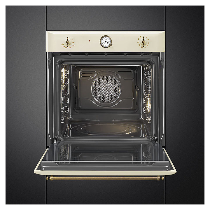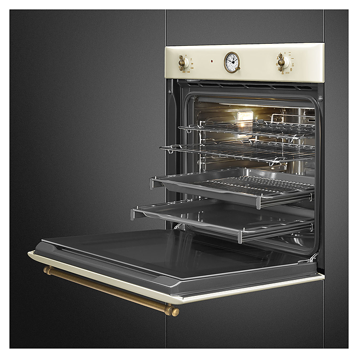 Духовой шкаф Smeg SF855PO предназначен для приготовления блюд средиземноморской кухни, различного жаркого, отбивных, колбас и бекона, а также выпечки хлеба, пирожных и печенья. Управление прибором происходит с помощью поворотных переключателей. Особенности: