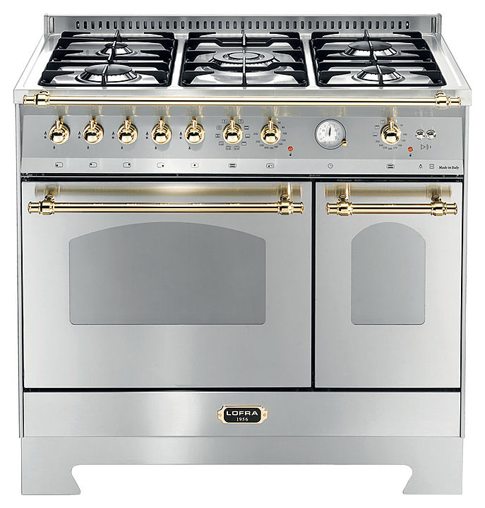 Газовая плита Lofra RSD 96 MFTE предназначена для приготовления широкого спектра первых и вторых блюд, а также выпечки и десертов в домашних условиях. Модель оснащена 2 духовыми шкафами и 5 газовыми конфорками Sabaf Series III разного размера. Варочная панель выполнена из матовой нержавеющей стали, решетки варочной панели - из чугуна, дверь снабжена вставкой из тройного закаленного стекла, два слоя которого обладают отражающими свойствами для меньшего рассеивания тепла. В комплект поставки входят глубокий противень, 2 решетки для духового шкафа, 3 чугунные решетки для варочной поверхности, форсунки для сжиженного газа. Варочная панель: