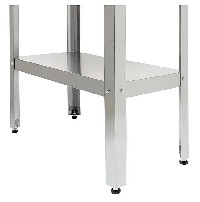 Столешница стола Koбор СПБ-150/70/430 произведена из высококачественной нержавеющей стали, а также для увеличения прочности и во избежание прогибания укреплена ЛДСП толщиной 16 мм. Ножки стола регулируются по высоте, что помогает избежать наклона рабочей поверхности стола. Каркас стола выполнен из нержавеющего уголка. Товар поставляется в разобранном виде и в упаковке для облегчения транспортировки.