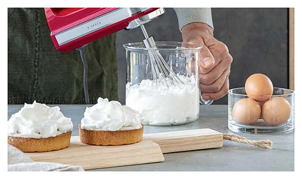 Ручной миксер KitchenAid 5KHM9212EER используется для замешивания теста, соусов и кремов, приготовления коктейлей, взбитых сливок и яичных белков.Модель оснащена электронным управлением и мощным двигателем постоянного тока с датчиком, поддерживающим оптимальную для выбранного режима скорость, независимо от плотности и вязкости продуктов. Корпус выполнен из пластика. Комплектация: