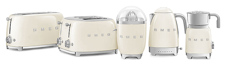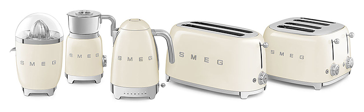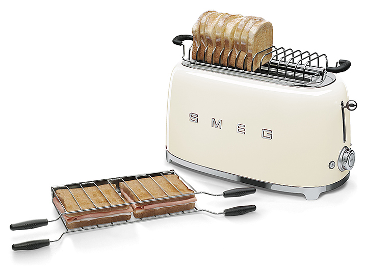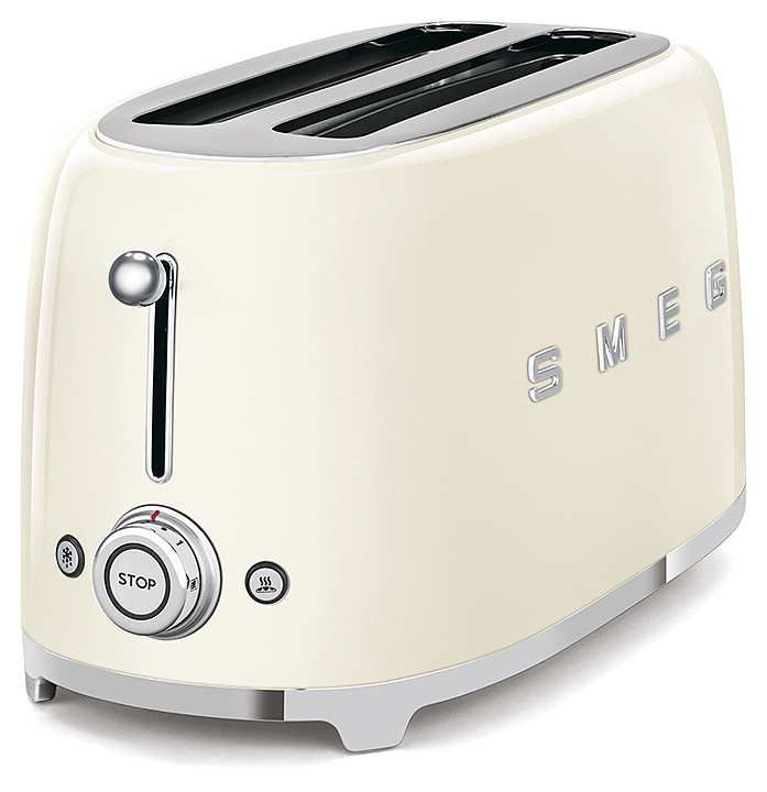 Тостер Smeg TSF02CREU используется для обжаривания ломтиков тостового хлеба. С помощью дополнительно приобретаемых держателей тостер также можно применять для подогрева булочек или сэндвичей. Прибор отличается уникальным дизайном благодаря исполнению в стиле 50-х годов. В комплект поставки входит съемный поддон из нержавеющей стали для крошек. Особенности: