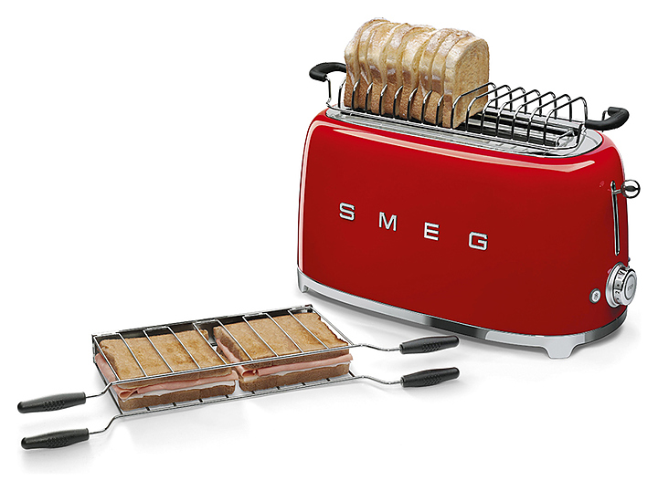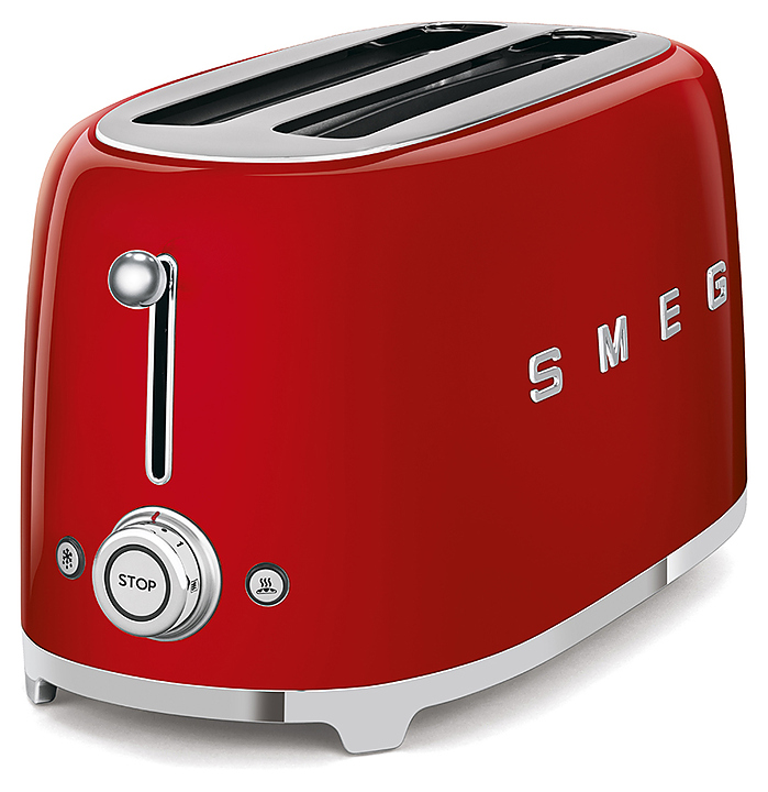 Тостер Smeg TSF02RDEU используется для обжаривания ломтиков тостового хлеба. С помощью дополнительно приобретаемых держателей тостер также можно применять для подогрева булочек или сэндвичей. Прибор отличается уникальным дизайном благодаря исполнению в стиле 50-х годов. В комплект поставки входит съемный поддон из нержавеющей стали для крошек. Особенности: